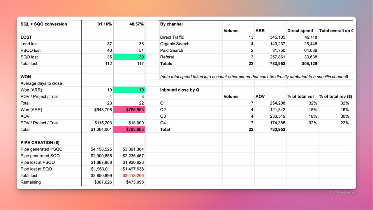By reducing SQL volume while improving paid traffic quality and lead qualification criteria, win rates improved by 75%. This underscores why you must track performance and model your unit economics across the entire funnel, from first session to closed-won.